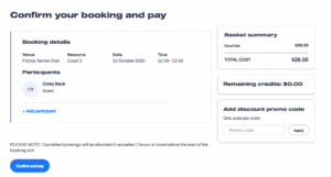 Confirm the booking details and pay for the court online using a credit card.