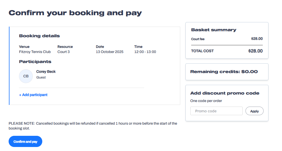 Confirm the booking details and pay for the court online using a credit card.