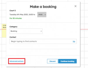 Club admins have the ability to enter bookings manually. Any bookings made by this process and via the ‘advanced options’ will bypass the payment method. Therefore the club may also need to manually collect payment for these bookings “offline”.
