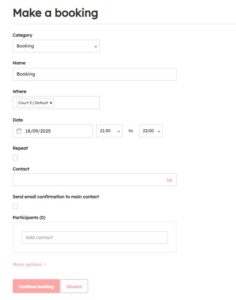 You will need to ensure you select a contact for the booking – if they’re an existing contact in your contact list, start typing their name and then select them. Otherwise, if the search doesn’t find the contact you may need to add them as a contact. Once a contact is selected, you will be offered the option to Send an email confirmation (which we advise to let the player know you’ve made a booking in their name and share the club’s booking instructions)